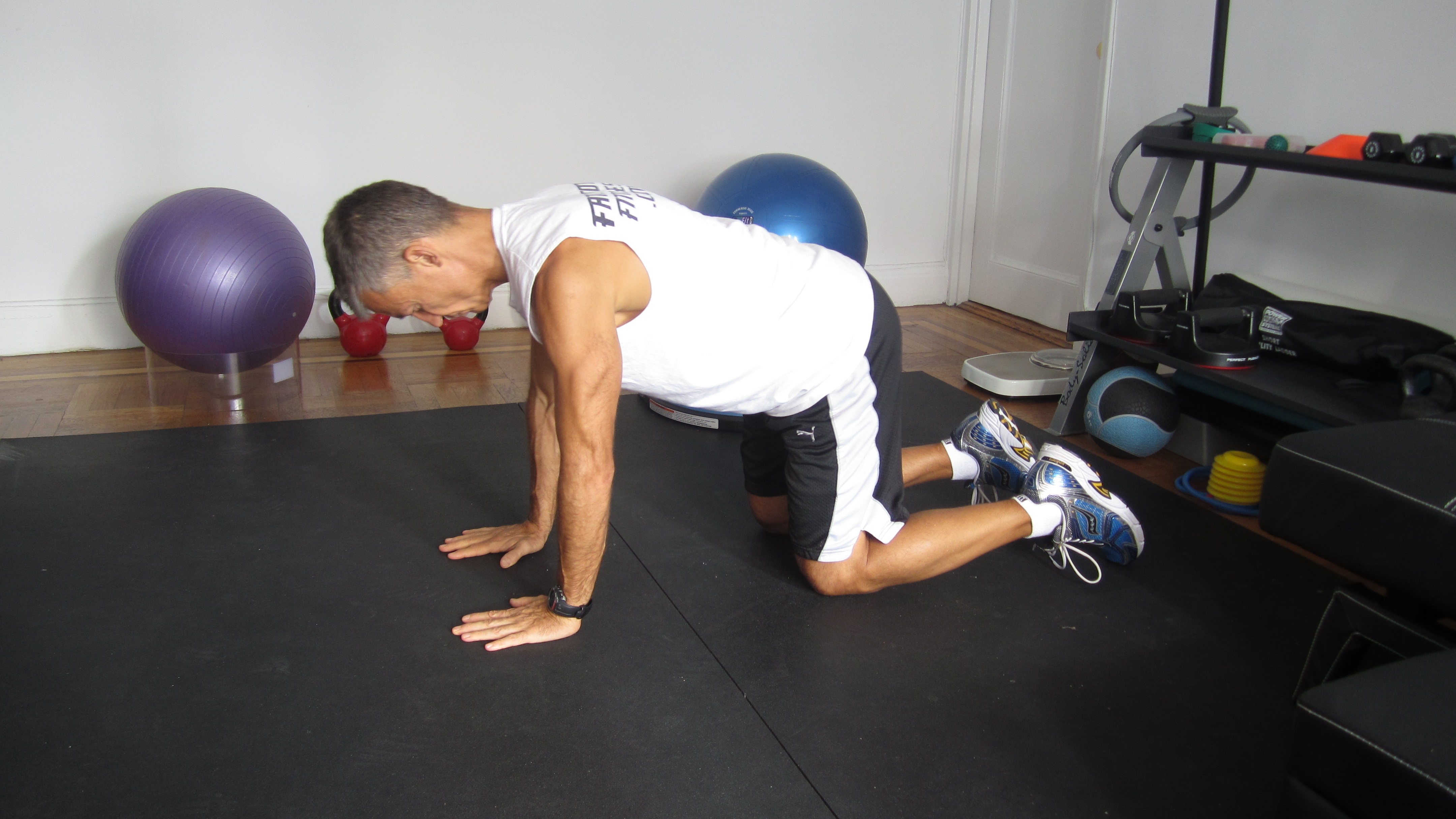 Kneel down and get on all fours. Hence the name Quadruped. Place your hands directly under your shoulders and keep your elbows unlocked. Check to see that your knees are directly under your hip sockets. This may not happen automatically. Keep your neck long from the back, you will be looking straight down. In this position, draw your stomach muscles up toward your spine, without moving your back. These muscles are your Transverse Abdominals very important muscles. They are your inner core. This exercise is designed to strengthen them so pay close attention to what is happening there. This position in the basic Quadruped.